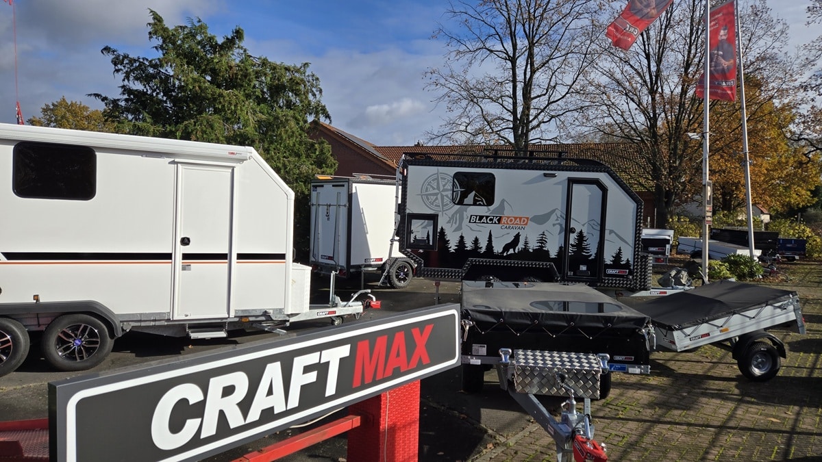 CRAFTMAX® BLACK BROTHER EXP-5 13 OffRoad 1300 Kofferanhänger 3.05×1.59×1.80m mit Ladebordwand, Seitentür, Frontfenster, großes Heki-Dachfenster, ALU-Felgen – 100km/h*
