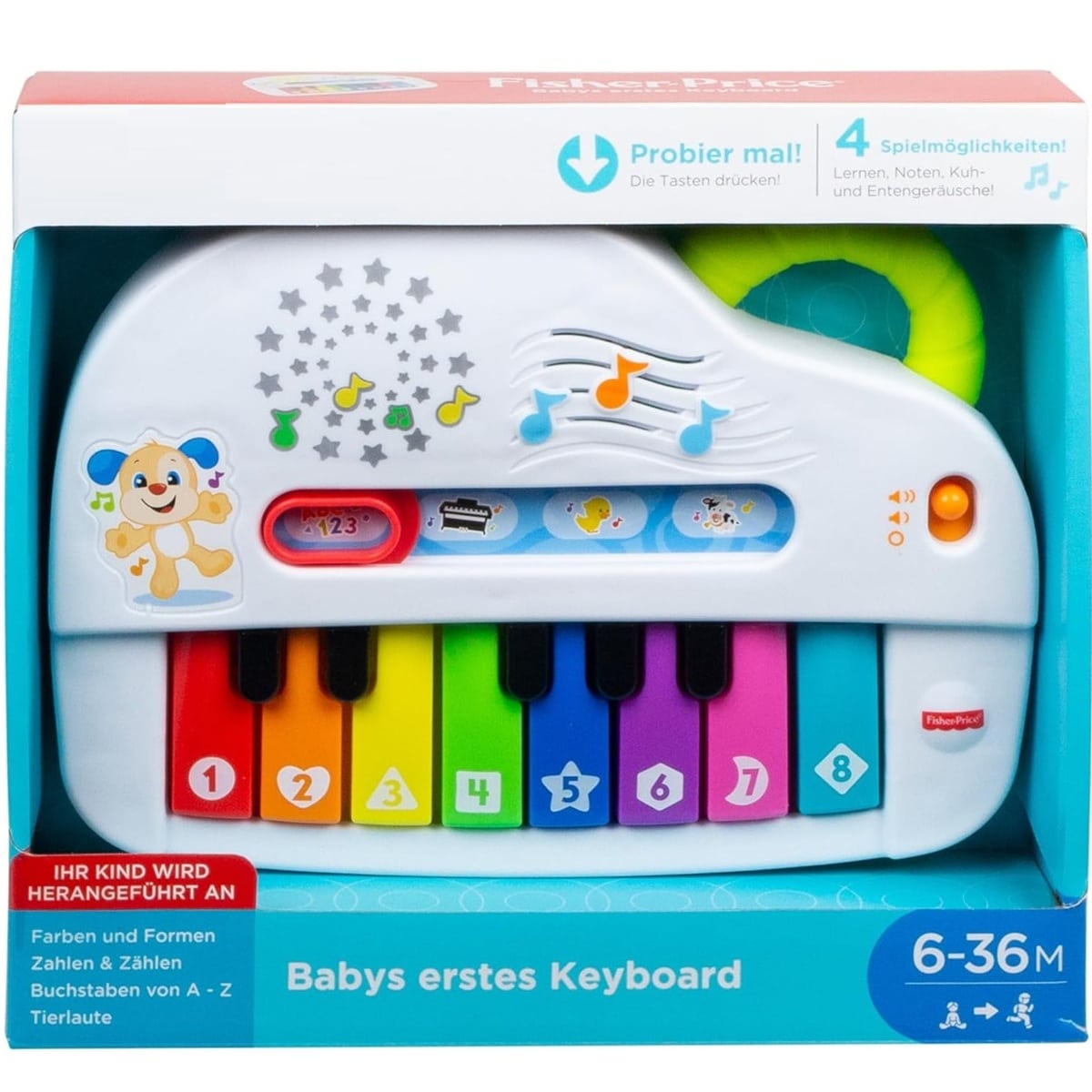 - 4 Spielmöglichkeiten. Echte Klaviernoten, Entengeräusche, Kuhgeräusche und lehrreiche Lieder und Sätze