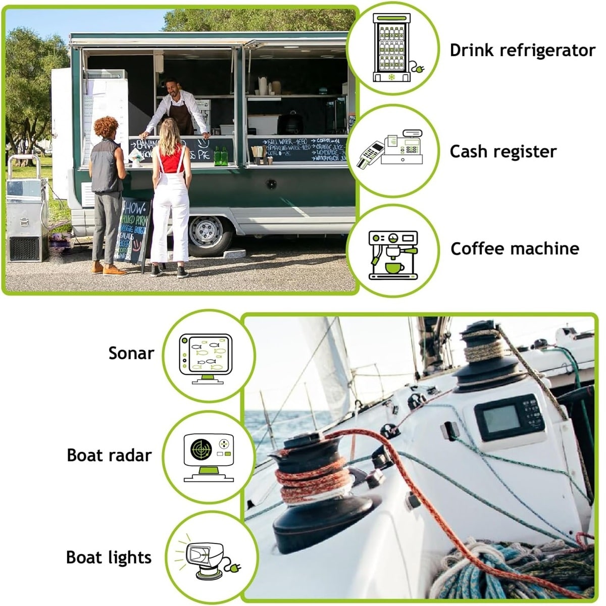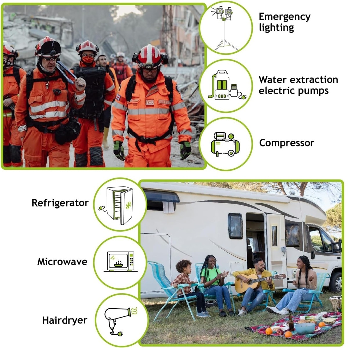- Vielseitige Anschlussmöglichkeiten: Ausgestattet mit zwei Schuko-Ausgangssteckern 16A und einem 12V DC 8A Ausgang, bietet der Stromgenerator flexible Einsatzmöglichkeiten; Perfekt für die Stromversorgung von Werkzeugen, Geräten und Elektronik, egal ob beim Heimwerken oder auf Reisen