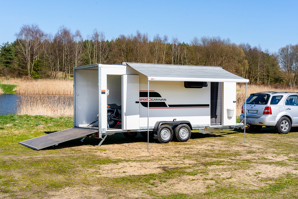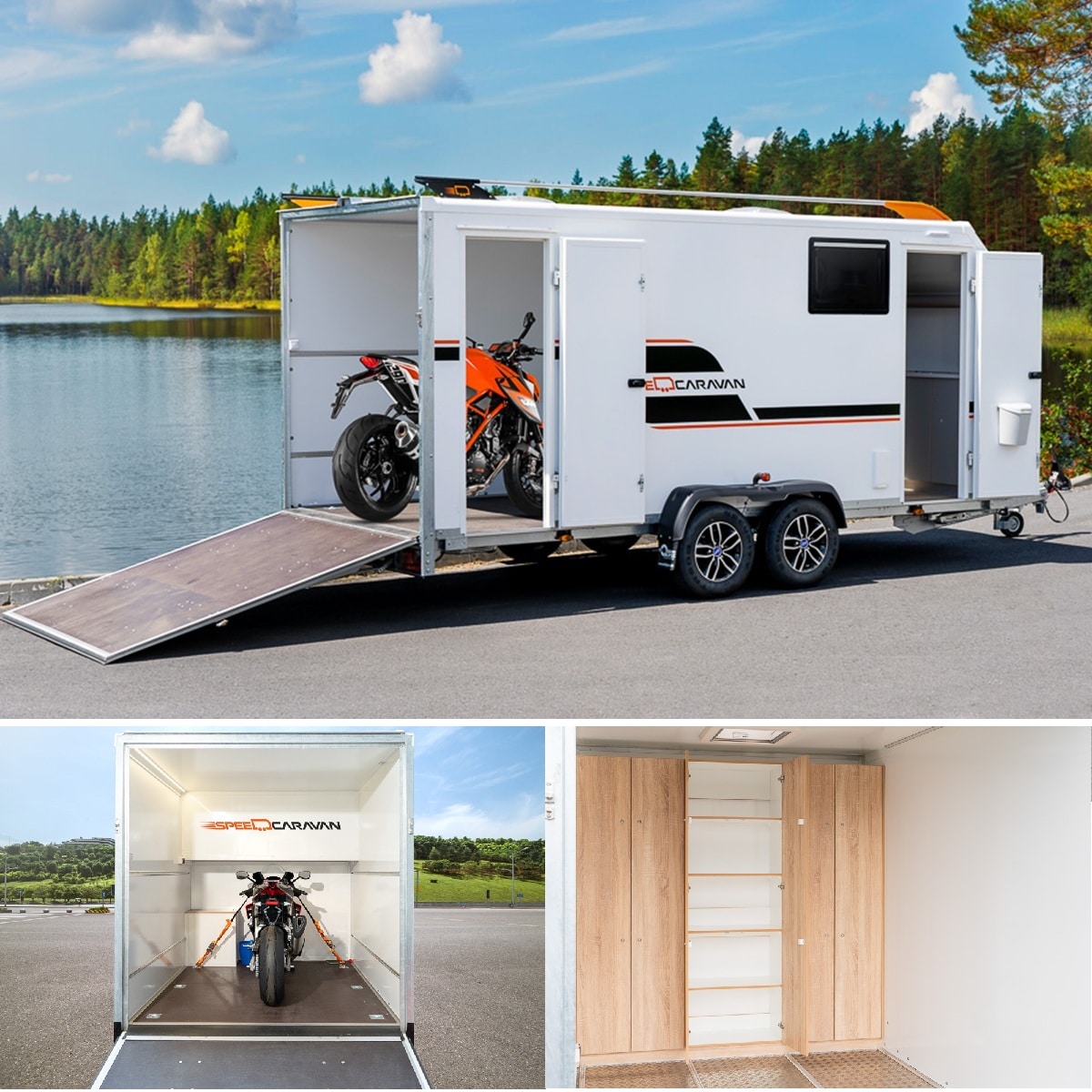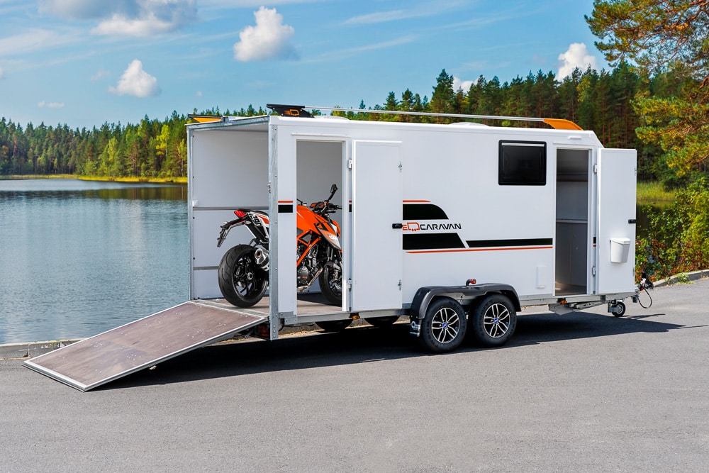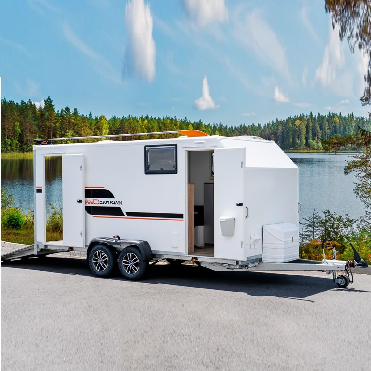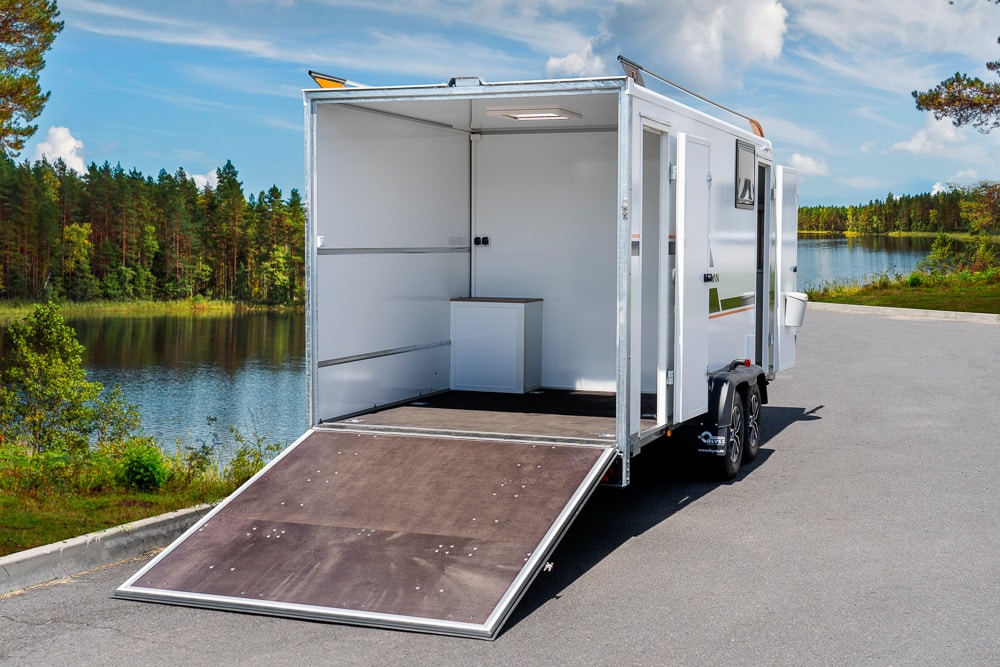 Der geräumige und voll ausgestattete Wohnraum mit Bett und Küche verfügt über einen separaten Sanitärbereich (mit Toilette und Dusche – optional). Im hinteren Teil des Anhängers befindet sich ein Laderaum, der mit einer Flügeltür oder Heckklappe ausgestattet sein kann, um verschiedene kleine Fahrzeuge wie ein Fahrrad, Motorrad, Schneemobil oder Quad sicher zu transportieren. Genießen Sie Ihre Freizeit in vollen Zügen, wo immer Sie wollen.