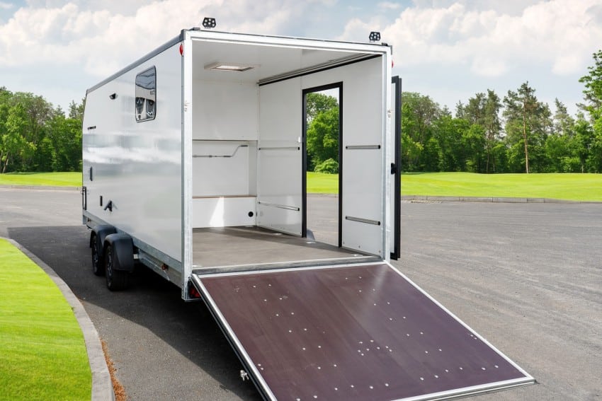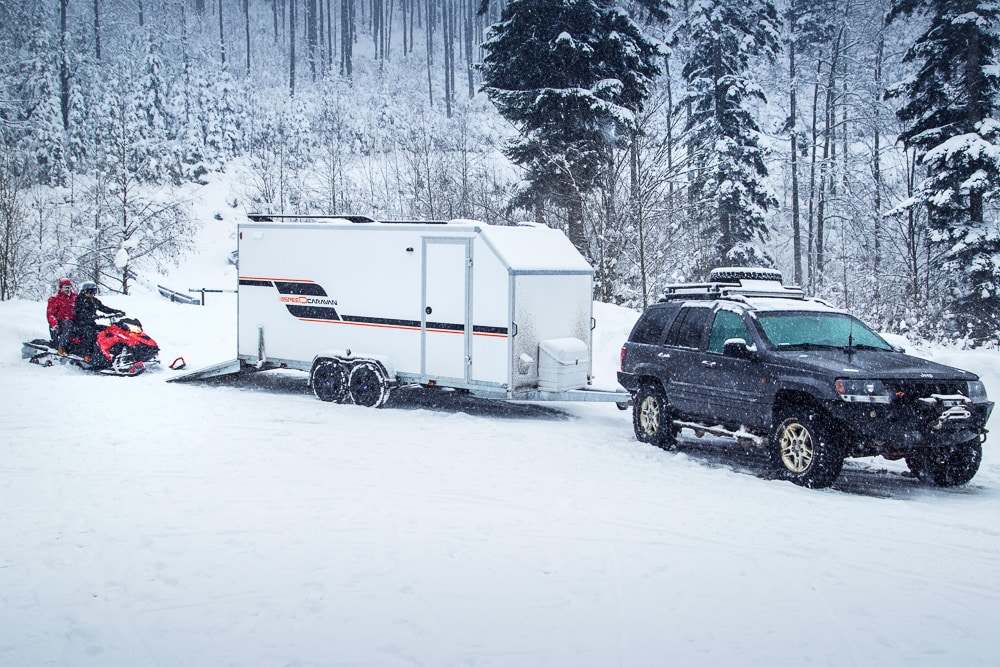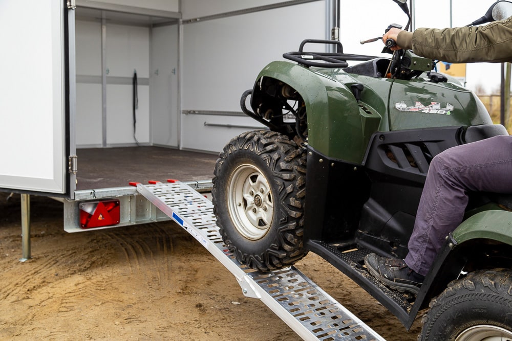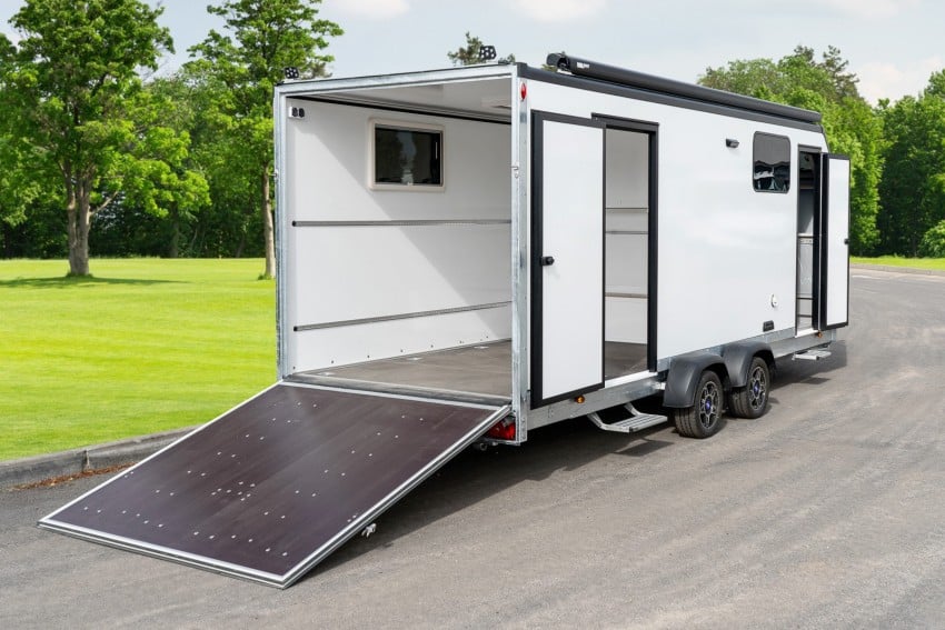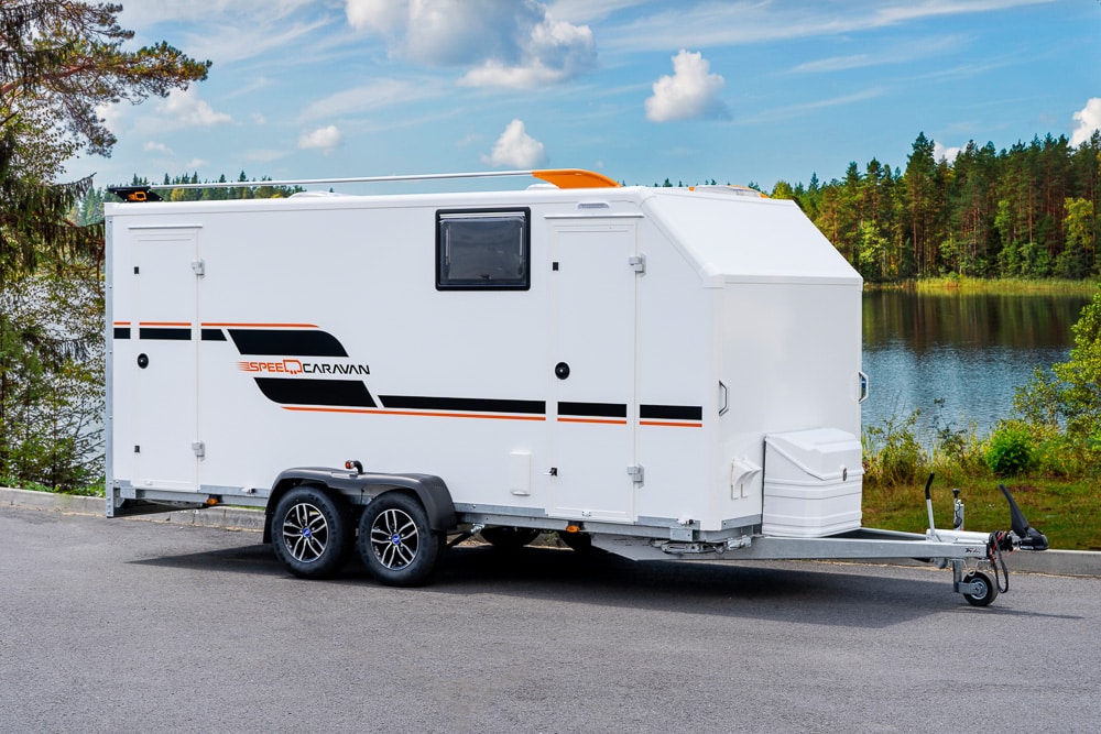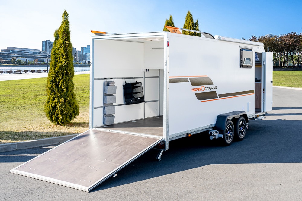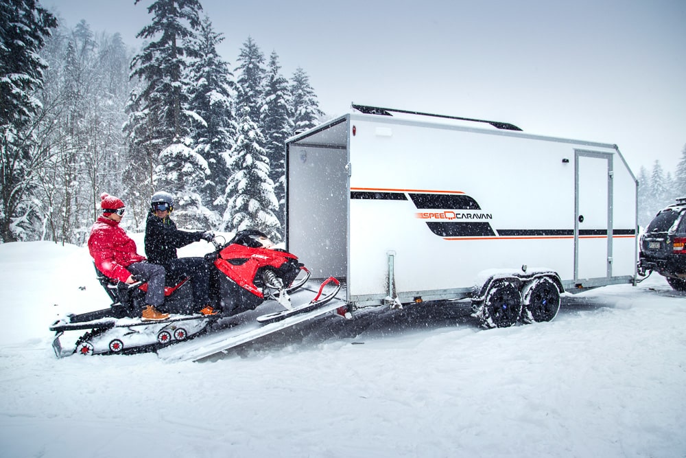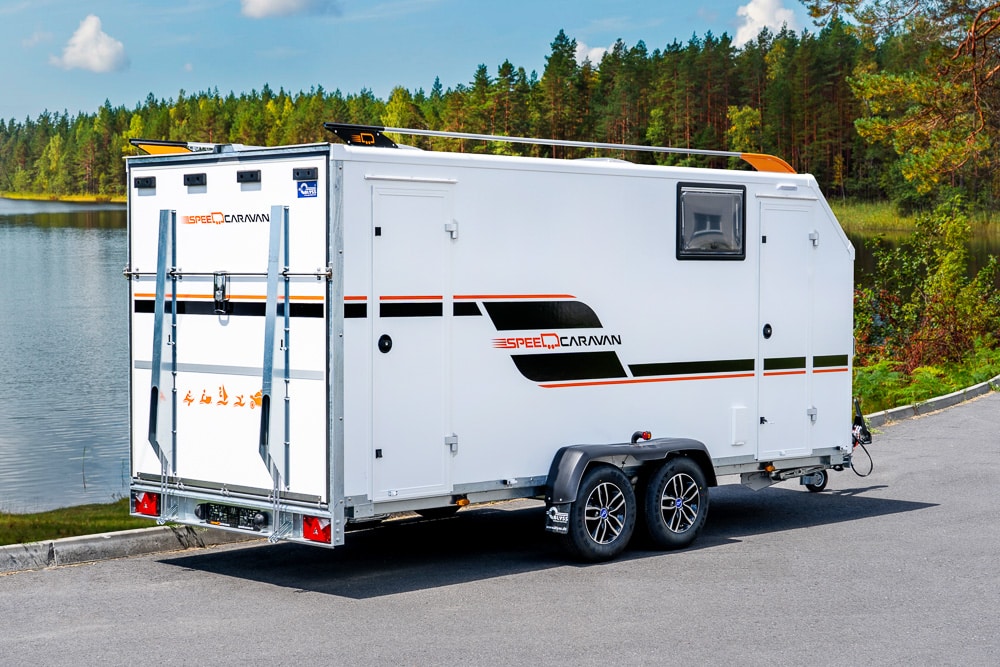 Der geräumige und voll ausgestattete Wohnraum mit Bett und Küche verfügt über einen separaten Sanitärbereich (mit Toilette und Dusche – optional). Im hinteren Teil des Anhängers befindet sich ein Laderaum, der mit einer Flügeltür oder Heckklappe ausgestattet sein kann, um verschiedene kleine Fahrzeuge wie ein Fahrrad, Motorrad, Schneemobil oder Quad sicher zu transportieren. Genießen Sie Ihre Freizeit in vollen Zügen, wo immer Sie wollen.