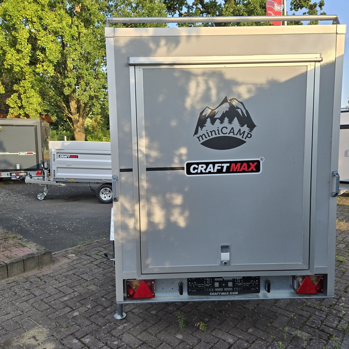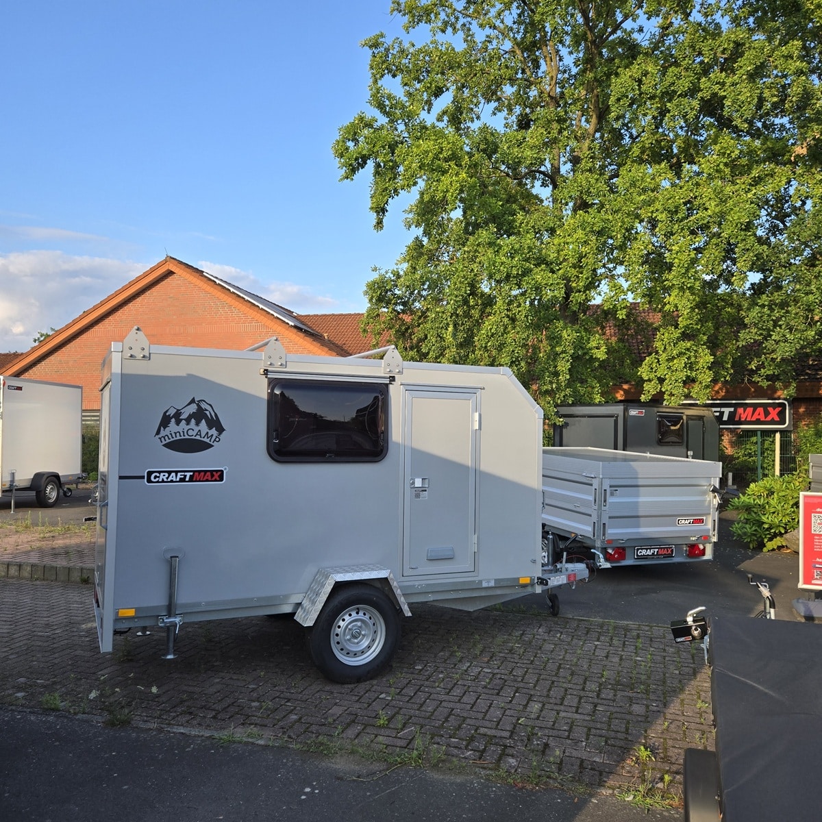 CRAFTMAX® OffRoadLine® 750 mini Camping-Anhänger mit Klappe nach oben, 2 Fenster, Tür, 3 Dachträger, Siebdruck-Bodenplatte, Elektroanschluss mit Sicherungskasten