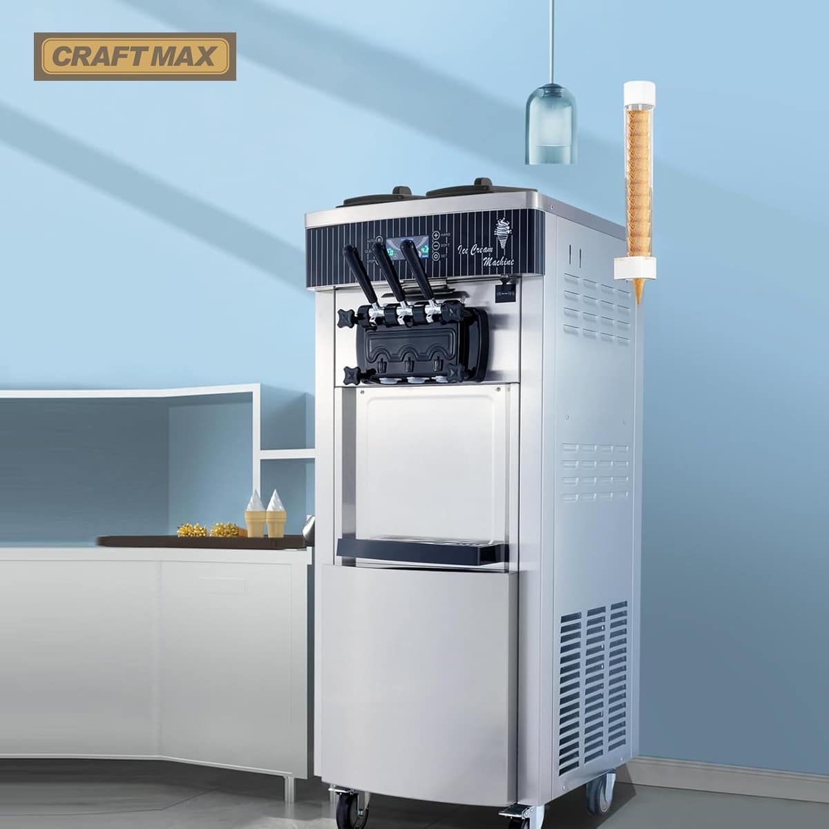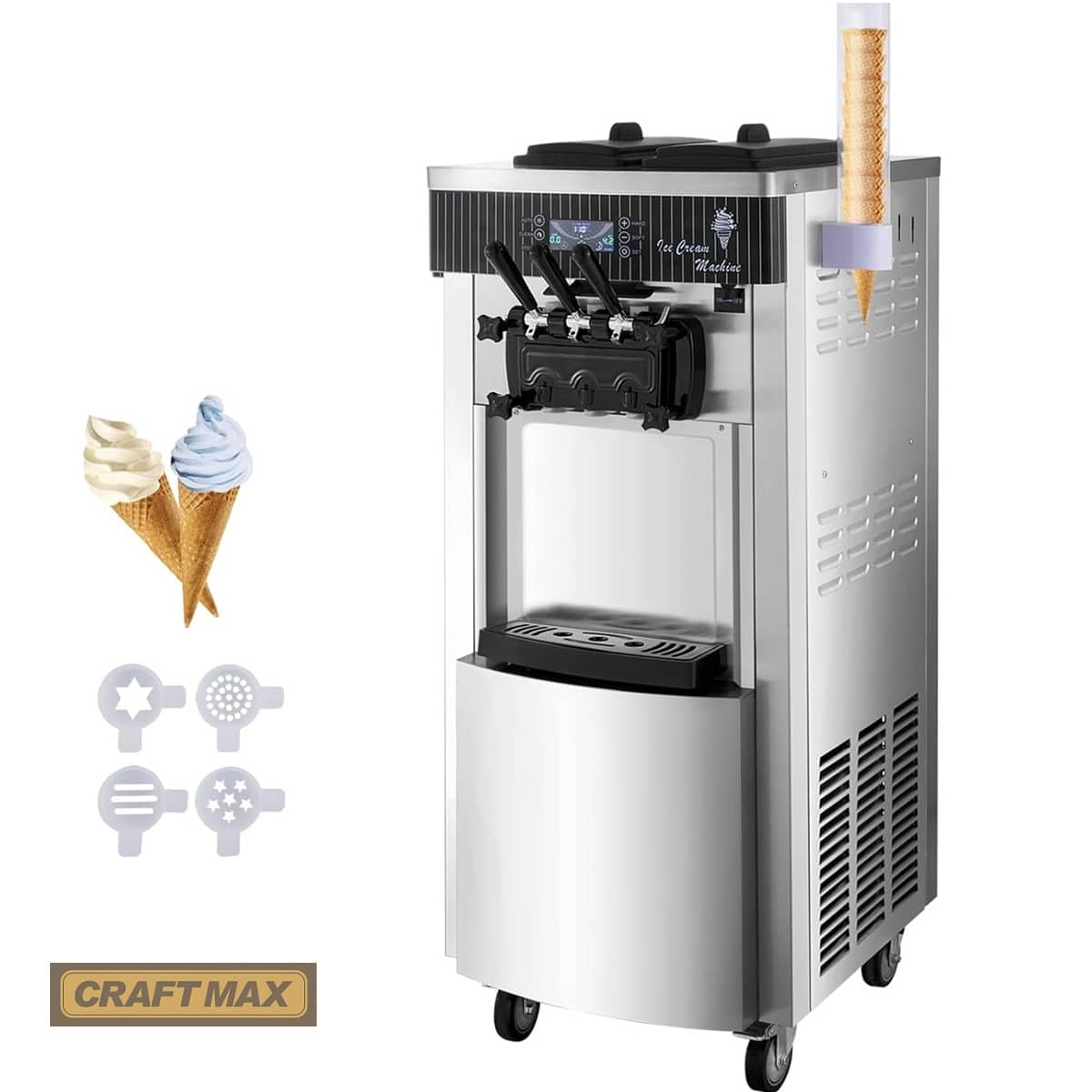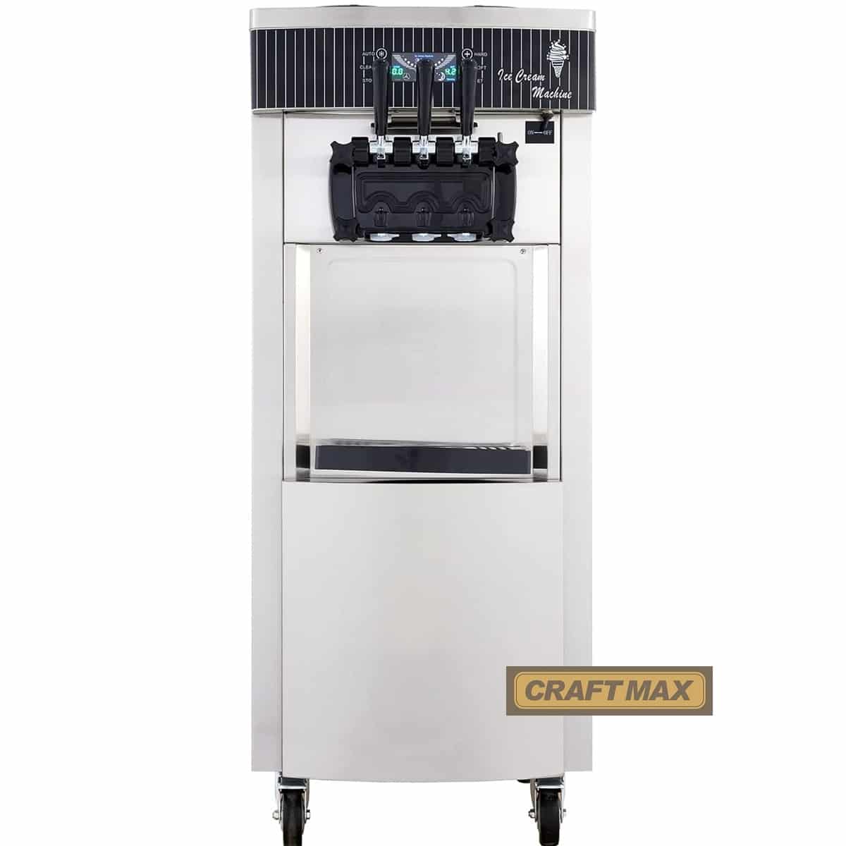 - Die Softeismaschine, der Speiseeisbereiter von CRAFTMAX® DE-Gastro®produziert mit ihrem leistungsstarkem 2.200 W-Kompressor Speiseeis in 3 Geschmacksrichtungen mit