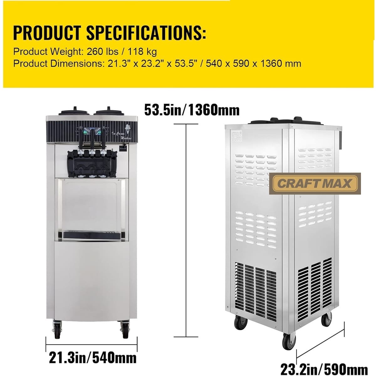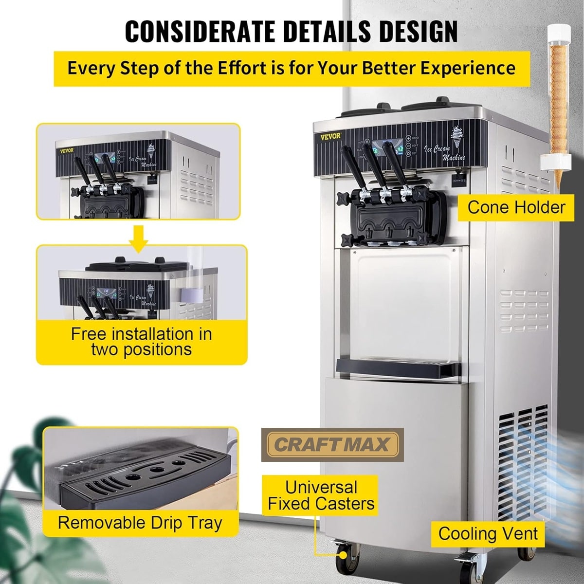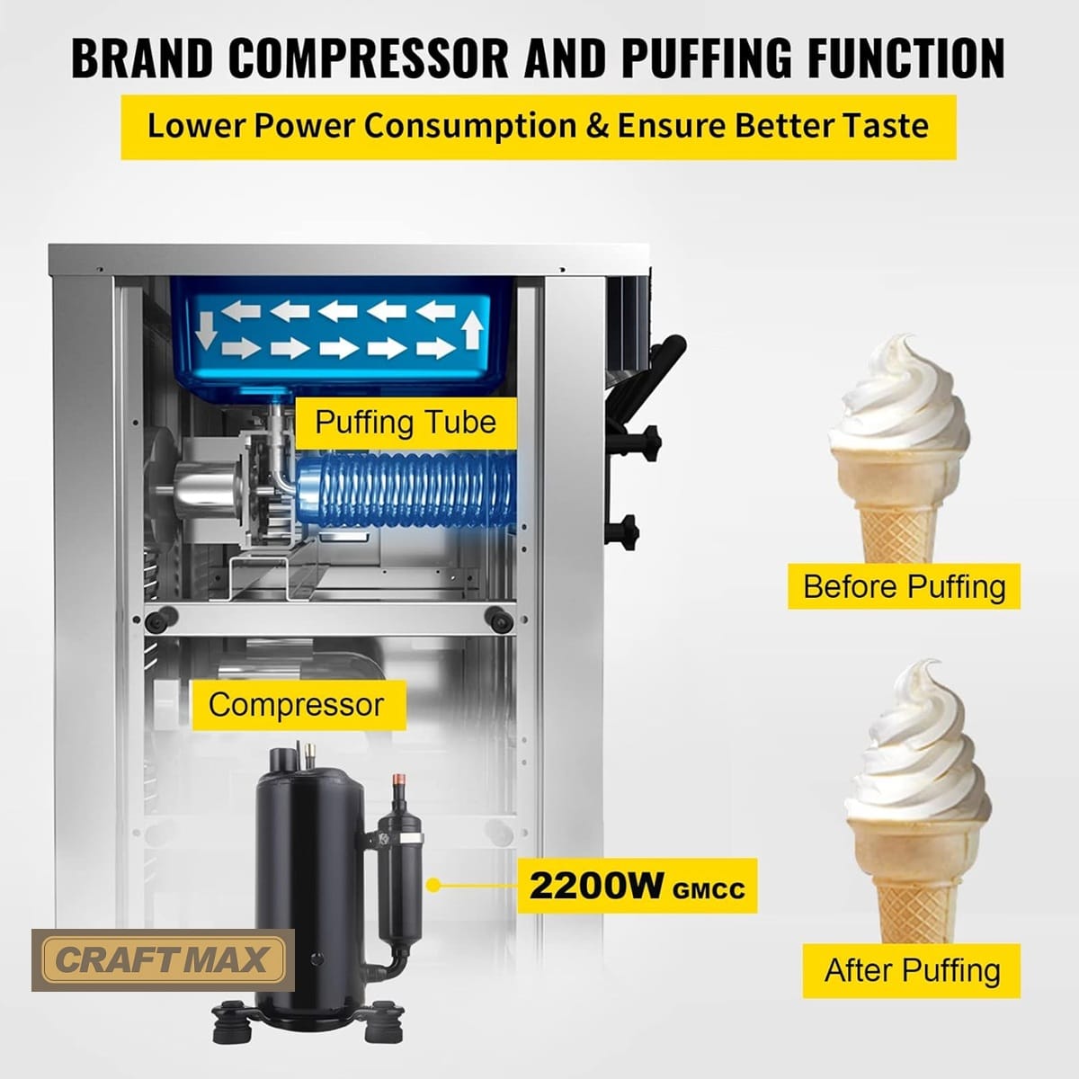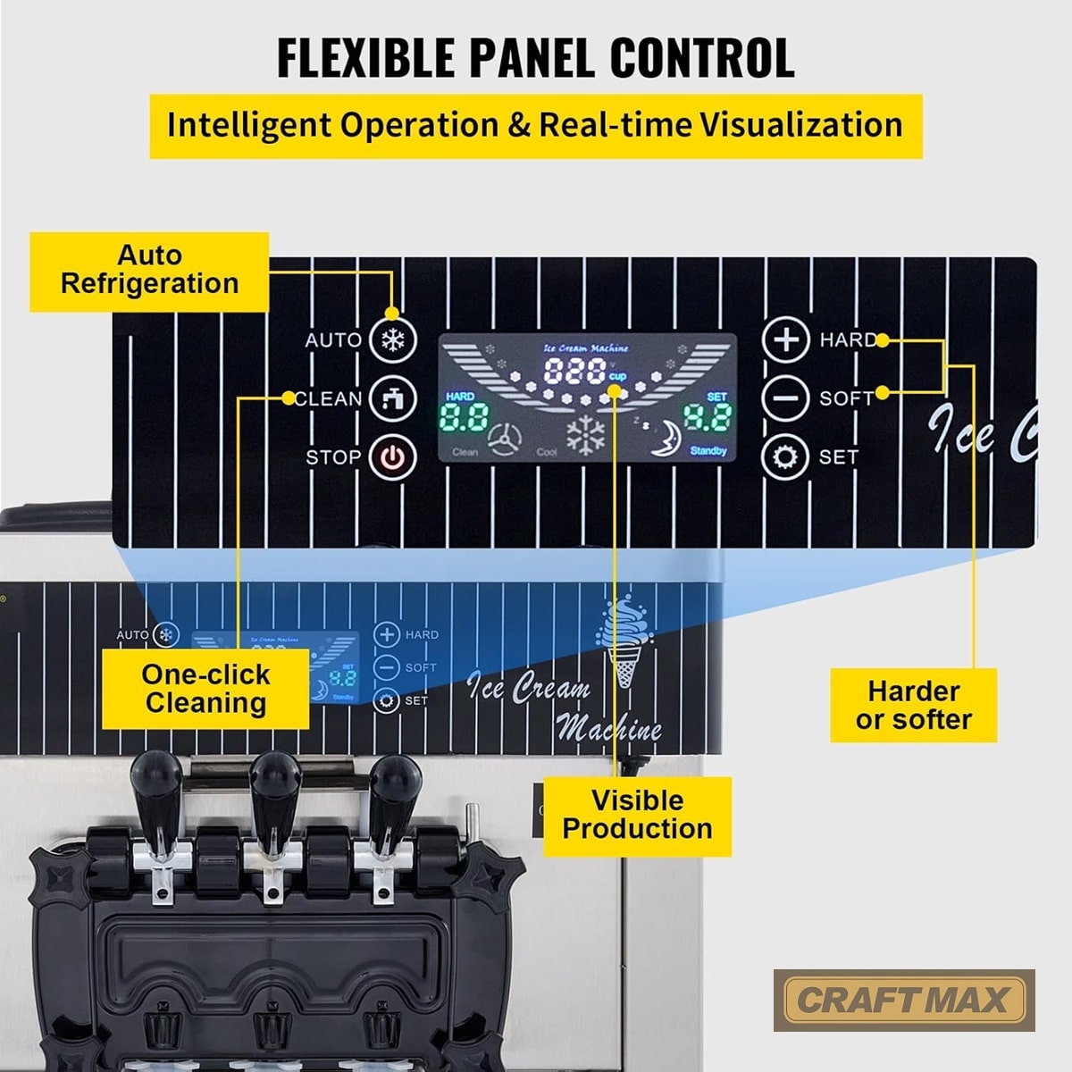 - Die Softeismaschine, der Speiseeisbereiter von CRAFTMAX® DE-Gastro®produziert mit ihrem leistungsstarkem 2.200 W-Kompressor Speiseeis in 3 Geschmacksrichtungen mit