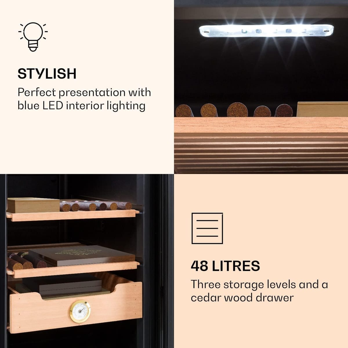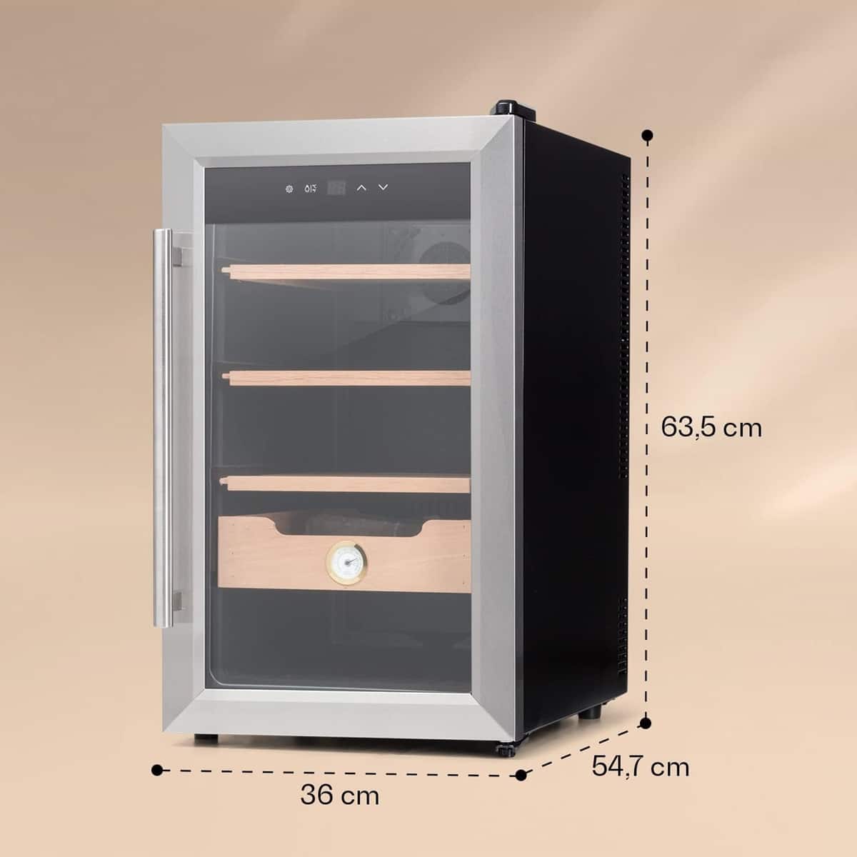 - GROßER INNENRAUM: Dank des großen Innenraumes vom Zigarren Humidor elektrisch finden zahlreiche Zigarren einen Aufbewahrungsplatz auf allen Lagerebenen und in einer Schublade aus Zedernholz, leichtgängige Schienen ermöglichen den schnellen und komfortablen Zugriff.