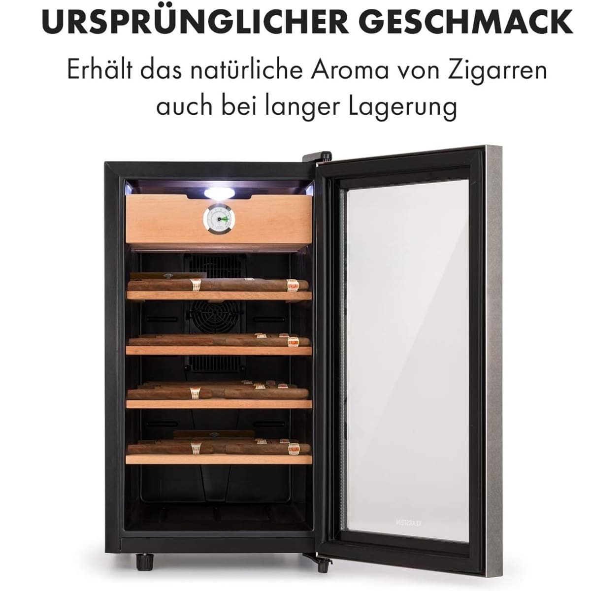 - INTEGRIERTES HYGROMETER: Das integrierte Hygrometer macht es dank Smart Mist System einfach, mit der Wasserschale die ideale relative Luftfeuchte von 70 % aufrechtzuerhalten – so trocknen die Zigarren im Zigarren Befeuchter nicht aus und behalten lange ihren vollen Geschmack.