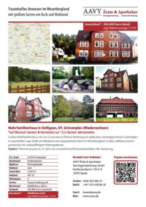 2014 bis 2019 wurden weitere Erneuerungen durchgeführt, wie der Wasser- und Elektroinstallation, die Installation von Gas-Etagenheizungen mit Warmwasseraufbereitung in den Wohnungen einschloss. Insgesamt gute Gebäudesubstanz, Keller trocken, Fassade in Ordnung, Dach u. Dachstuhl ohne Mangel, die leer stehenden Wohnungen müssen vor Neu Bezug komplett und allumfassend renoviert werden. Der große Garten grenzt an einen kleinen Bach, direkt am Waldrand, mit Blick in das Weserbergland. Verkehrsgünstige Lage mitten im Ort an Hauptstraße. PKW-Stellplätze im Hof. Hauptgebäude mit 5 Wohnungen. Große Remise zum Ausbau. Ehemaliger Kurort, SCHOTT Glaswerke (Hersteller von CERAN-Herdplatten, SAMSUNG Galaxy Flip/Fold Displays u.a.) als ortsansässiger Arbeitgeber.