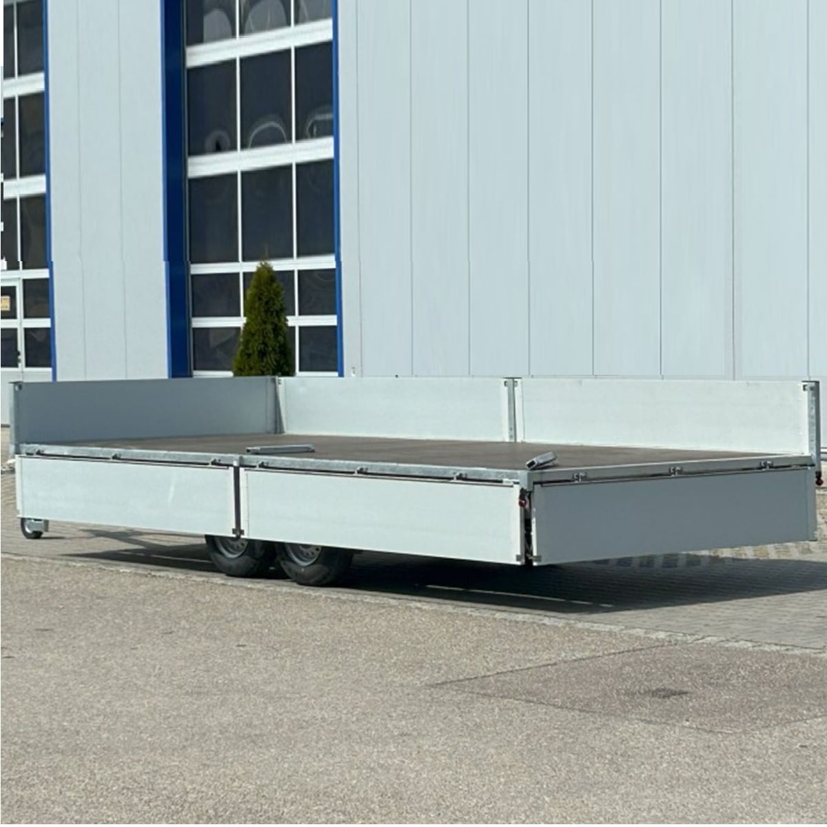 Bordwände: dreiseitig abklapp- und abnehmbare Bordwände aus Aluminium. Robuste und rostfreie versenkte Verschlüsse. Vier steckbare Eckrungen aus Stahl für hohe Belastung und einfache Beladung. Bordwände geteilt mit zwei zusätzlichen Mittelrungen.