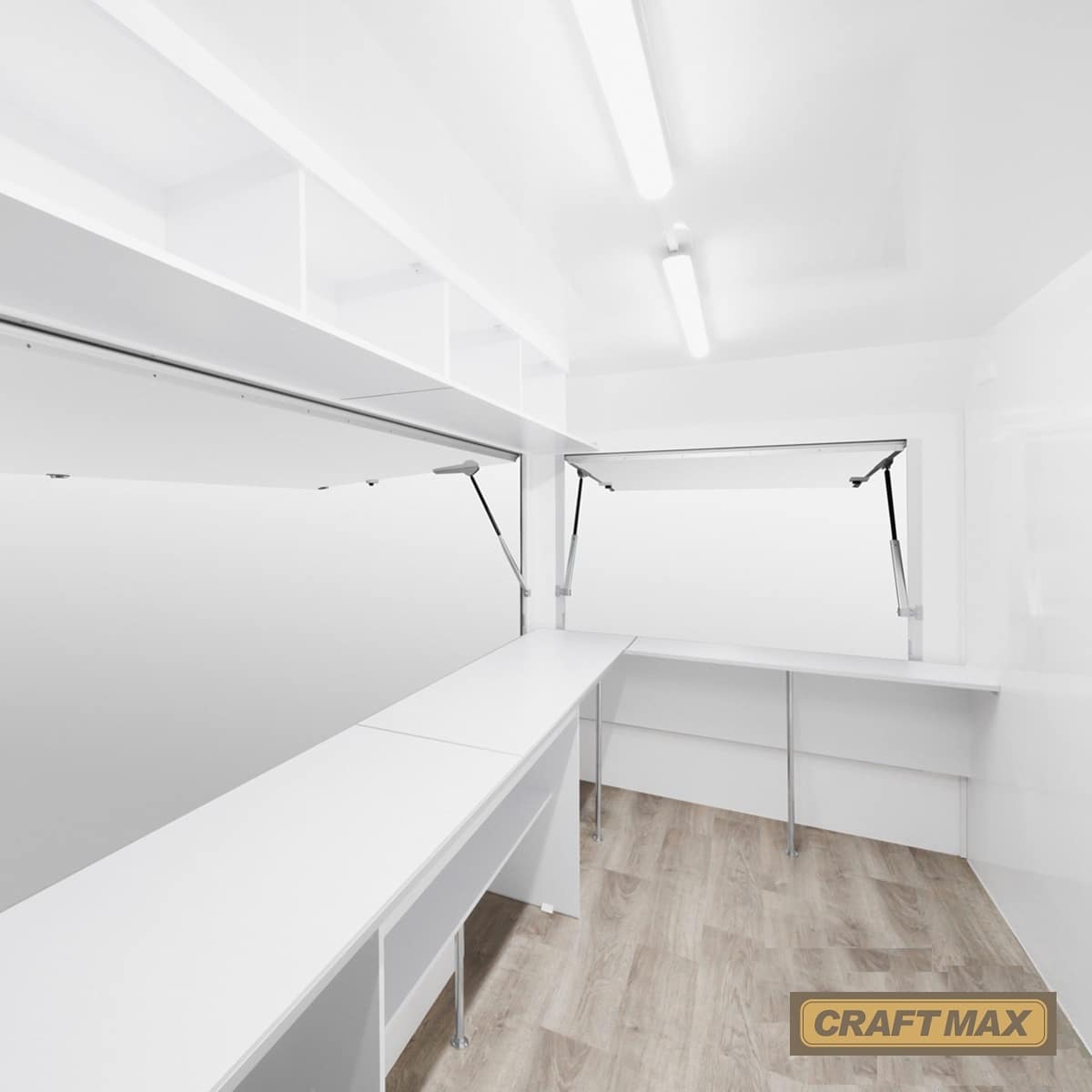 DE-Gastro® Verkaufsanhänger 2700 Tandem mit Thermo-XPS-Paneelen, 3 Verkaufsklappen, Scherenstützen, Innenausbau, LED-Licht, Stromanschluss, Teleskop Scherenstützen, weitere Extras…