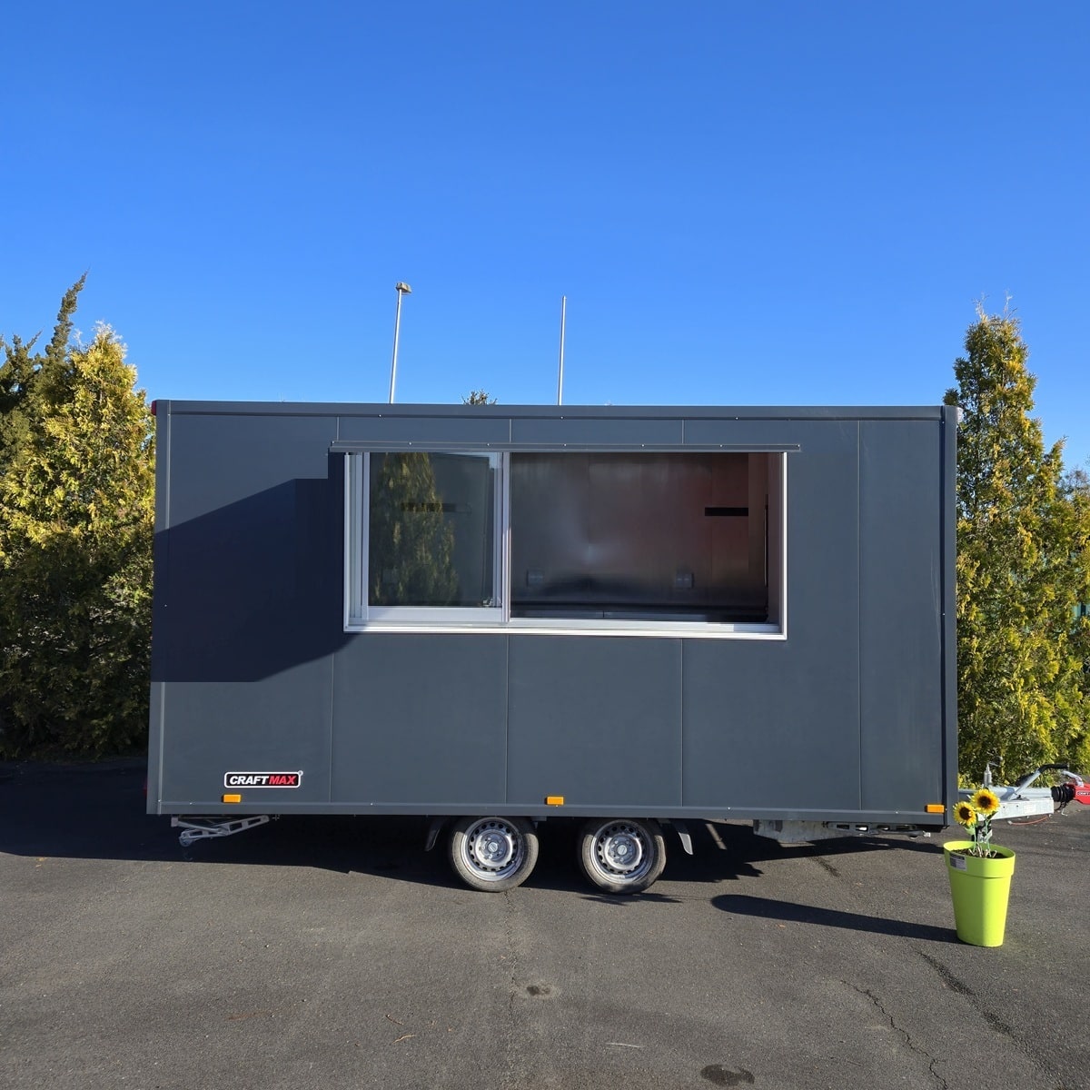 CRAFTMAX® Verkaufsanhänger “Foodtrailer 2700” Tandem mit Thermo-Sandwichpanele, seitlicher Verkaufsklappe, Kurbelstützen, Elektro-Paket, Edelstahl-Möbel, Kühlschrank, Gefriertruhe, Ventilator…