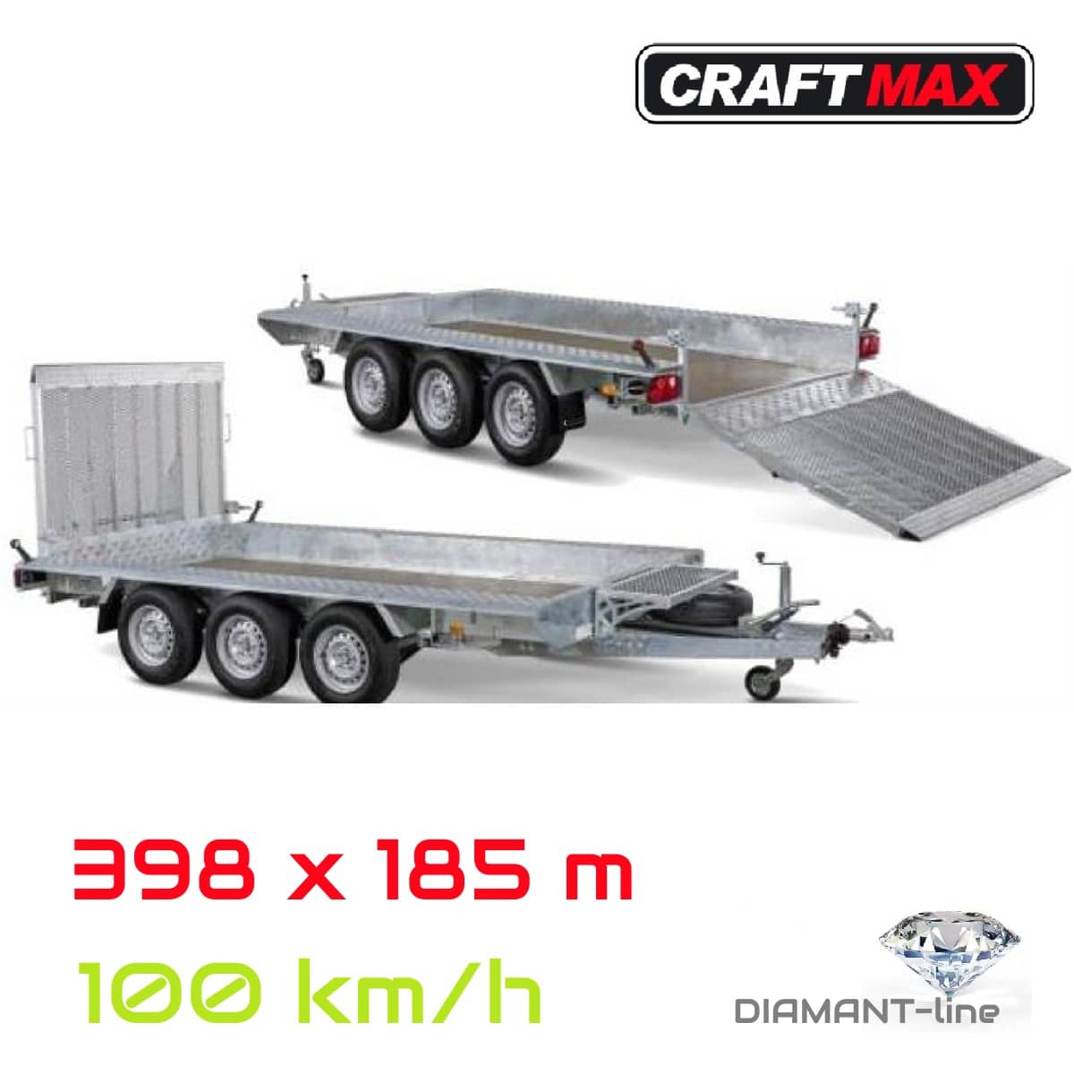CRAFTMAX® BAUMA® 3500 Tridem Baumaschinen Transporter mit breiter Auffahrklappe, Ersatzrad mit Halter